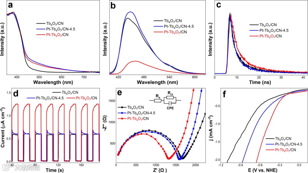 图5. Tb4O7/CN、Pt-Tb4O7/CN-4.5和Pt-Tb4O7/CN光催化剂的紫外可见漫反射光谱图 (a),光致荧光发光光谱图(b),时间分辨荧光衰减寿命曲线 (c),瞬态光电流密度曲线 (d),电化学阻抗图谱(e),线性扫描伏安曲线图 (f)。