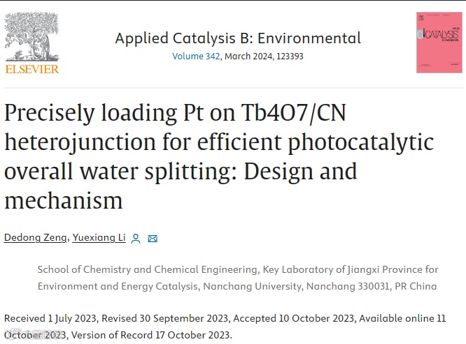 [1] Dedong Zeng , Fang He , Yuexiang Li, Construction of terbium oxide/polymer carbon nitride heterojunction for boosting photocatalytic overall water splitting without cocatalyst [J], Applied Catalysis A, General, 650 (2023) 118986.