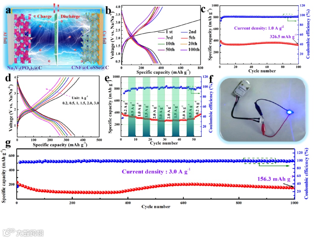 将CNF@CoSSe@C复合材料与Na3V2(PO4)3@C正极组装成全电池后,全电池在1.0 A g-1下的电流密度下循环100圈后仍能保持 326.5 mA h g-1的放电比容量。此外,即使在3.0 A g-1de 超大电流密度充放电,NVP@C//CNF@CoSSe@C全电池仍能在循环1000圈后保持156.3mAh g-1的放电比容量,展现出了巨大的商业化应用前景。