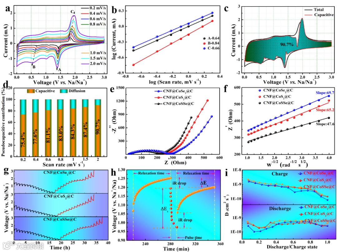 图4. CNF@CoSSe@C, CNF@CoS2@C和CNF@CoSe2@C三种材料的电化学动力学分析。