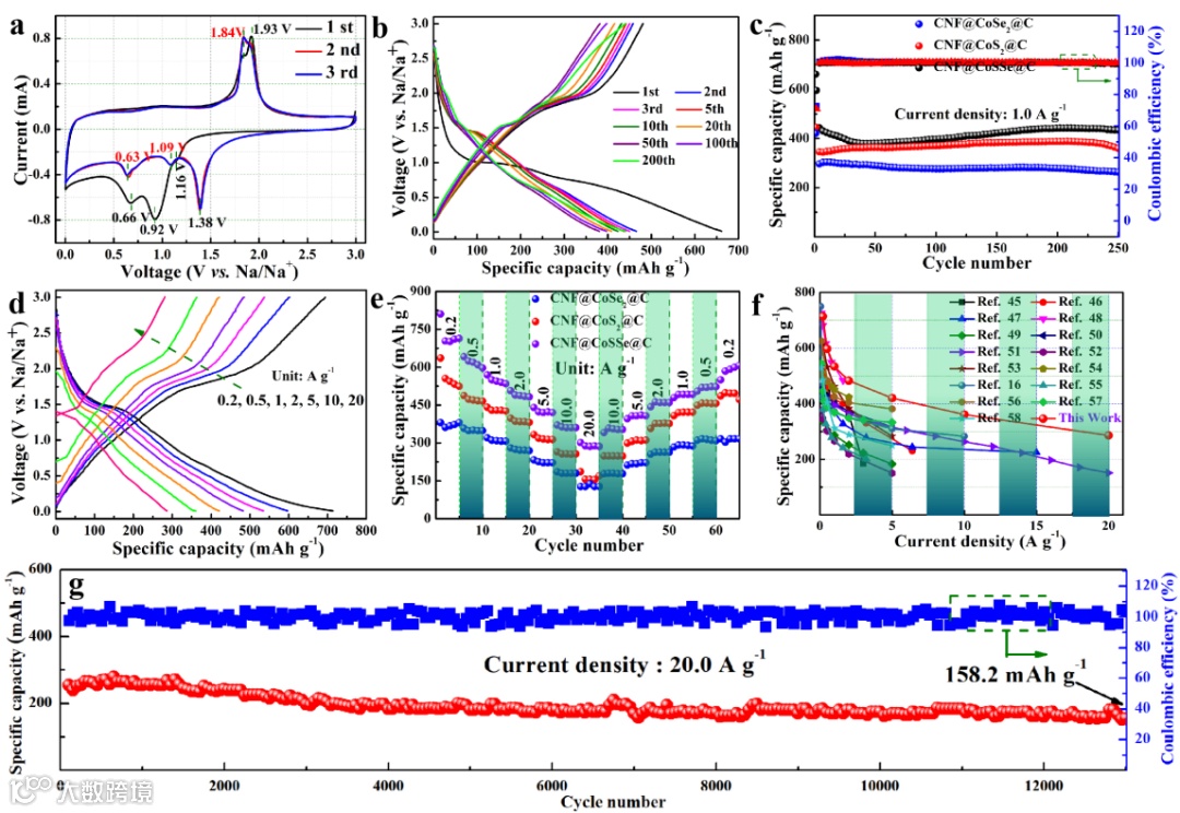 此外通过不同扫速下的CV曲线并结合GITT及EIS测试分析可知,CNF@CoSSe@C复合材料相比于CNF@CoS2@C和CNF@CoSe2@C材料具有更大的赝电容贡献比例,更优的钠离子扩散系数及离子传输速率。