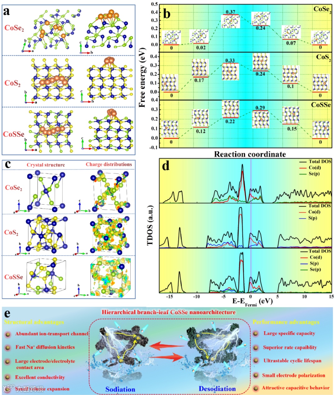 图6. CoSSe, CoS2和CoSe2三种材料的DOS、 电荷拆分、钠离子扩散能垒计算以及CNF@CoSSe@C复合材料优异电化学性能的机理图。