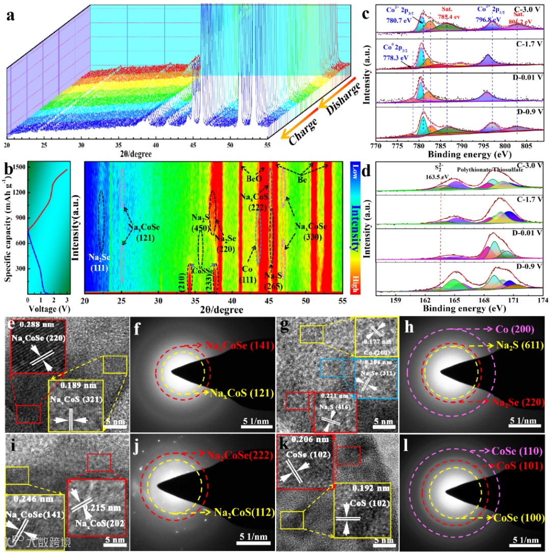 图5. CNF@CoSSe@C复合材料首圈电化学原位XRD表征以及非原位的XPS, TEM和SAED表征。