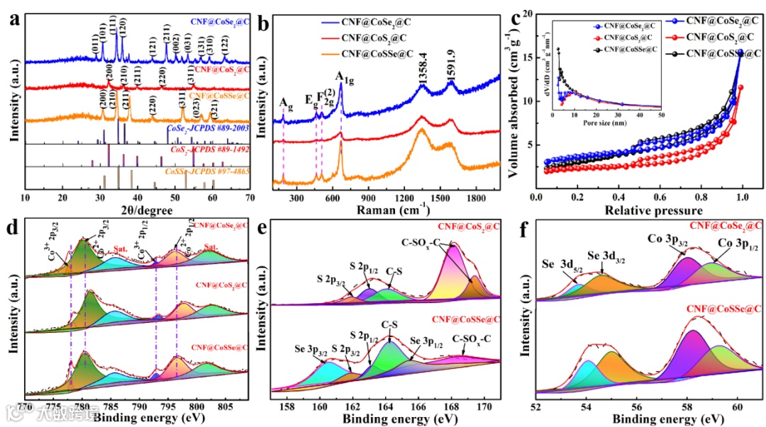 图2. CNF@CoSSe@C, CNF@CoS2@C和CNF@CoSe2@C三种材料的XRD, Raman, BET和XPS分析。