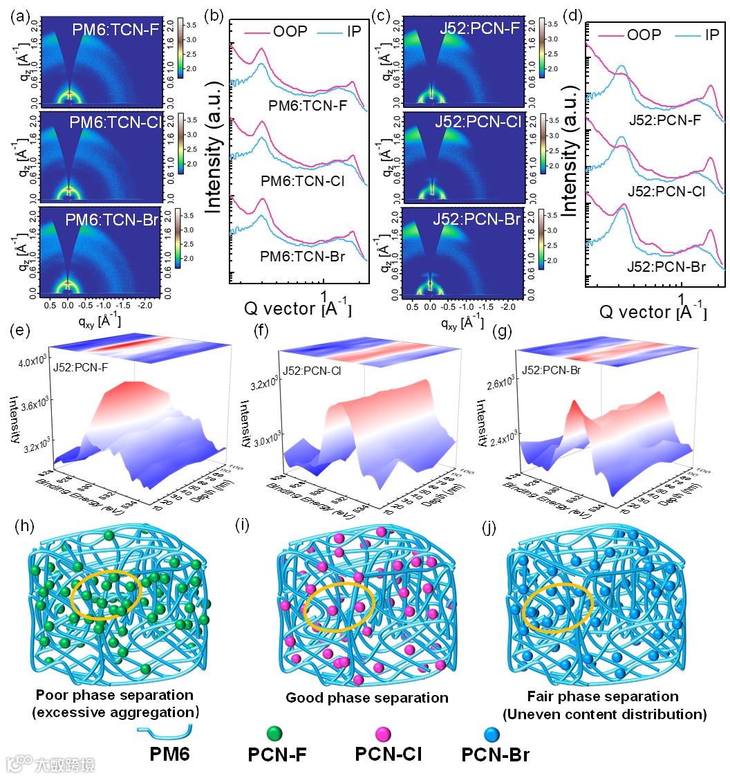 上述研究表明Cl取代的分子具有较大的激子扩散长度,那么激子可在长距离尺度上面传输和分离,在一定程度上有利于器件的性能。通过一系列测试表征,包括原位吸收、拉曼光谱、AFM、TEM和GIWAXS等测试,表明Cl取代的受体分子具有较高的结晶性和较好的薄膜形貌。进一步用不同深度的XPS测试发现,F和Br取代的受体分子相分离不完善,有倾向于聚集的特征,而Cl取代的受体分子的相分离优异,给受/体均与分布,十分有利于电荷分离和传输,故器件效率明显提高。