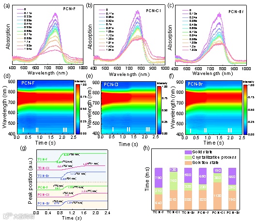 首先分别测试了不同卤素取代的受体分子的电子迁移率和电导率,Cl原子取代的分子具有较高的电子迁移率和电导率。其次测试了这些分子的单线态激子寿命,和激子扩散长度,研究表明,具有Cl取代的受体分子的激子寿命明显增加,而激子寿命增加是有利于激子的长距离扩散,避免无效的激子复合。此外,采用瞬态吸收测试了激子的扩散长度,结果表明,具有长寿命的激子,其激子扩散长度明显增加,而这又可以有效地抑制电荷复合,从而提高器件的Jsc。除此之外,我们采用原位吸收测试了薄膜的成膜结晶动力学过程。测试发现,Cl取代的受体分子具有较长的结晶过程,从而可以提高整体分子的结晶水平,有助于形貌。相反,F和Br取代的分子结晶过程相对较短,故其分子结晶程度不如Cl取代分子。