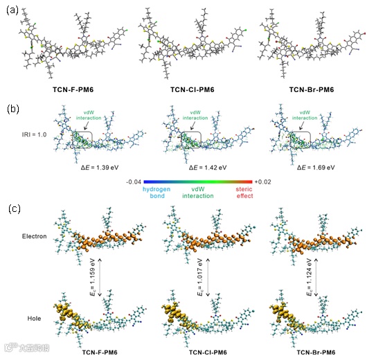 通过DFT和时间依赖的TD-DFT来从理论上研究F,Cl,Br原子取代对分子结合能,及电子-空穴结合能之间的影响。计算表明,随着F, Cl,Br原子的相对分子质量增加,相应的受体分子和聚合物之间的结合能依次增大。此外,进一步计算发现,Cl取代的受体分子与聚合物给体之间具有最小的电子-空穴结合能,这十分有助于器件中的电荷分离和转移,故Cl取代的受体分子器件电流较高。
