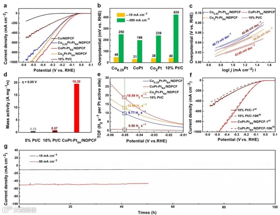 此外,CoPt-PtSA/NDPCF的电流密度达到−1000 mA cm−2时的过电位约474 mV,明显远优于商用10% Pt/C。而且,CoPt-PtSA/NDPCF的塔菲尔斜率,Pt质量活性和TOF值均优于商业化10% Pt/C,尤其是在−10 mA cm−2和−50 mA cm−2电流密度下分别循环100 h和50 h以及10000次CV循环,均表现出了优异的稳定性,可以进一步推广到实际应用中。