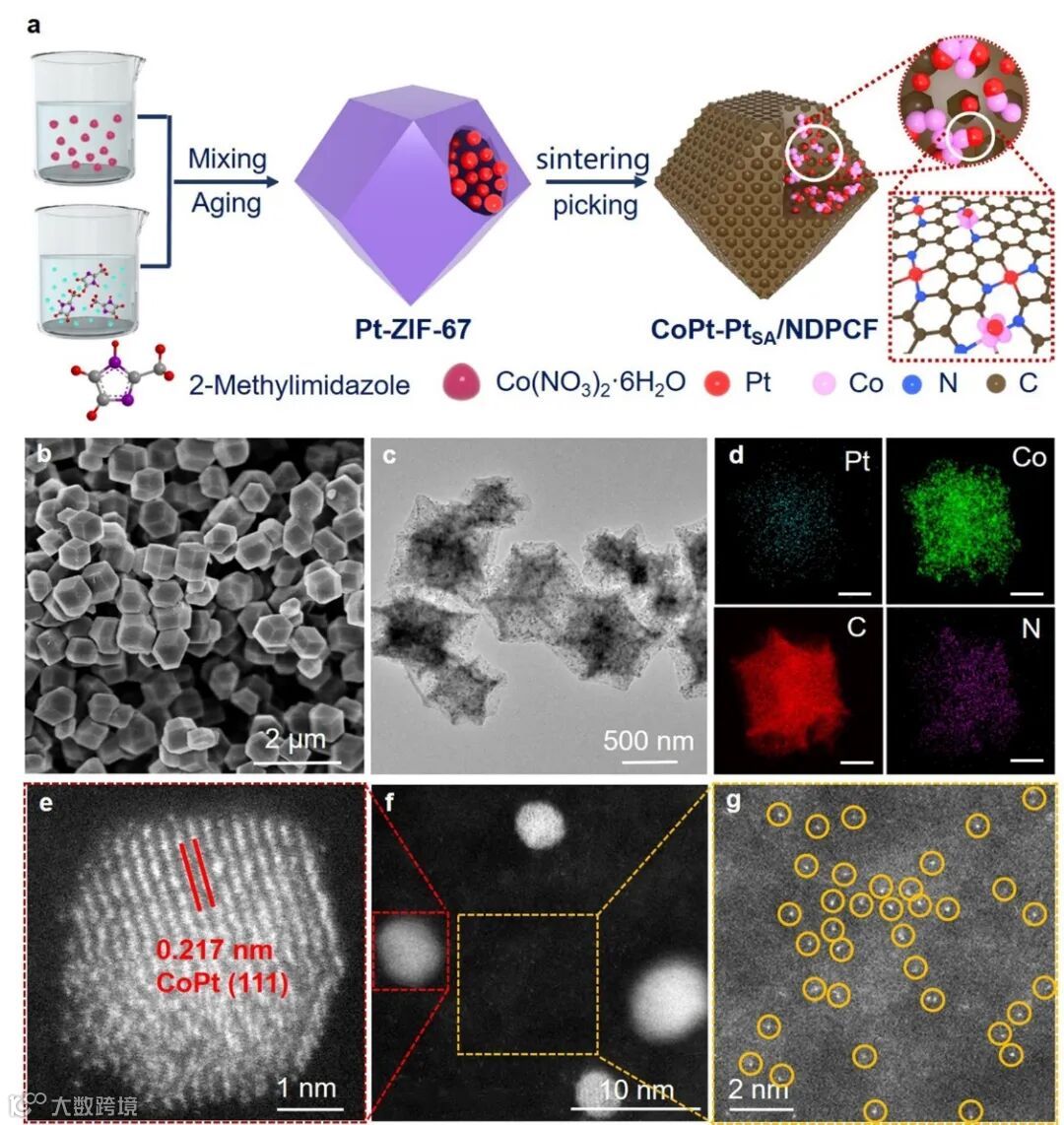 CoPt-PtSA/NDPCF的合成步骤如图1所示。首先,通过将~3 nm的Pt纳米晶体与ZIF-67前驱体复合,将Pt限制到ZIF-67的核内,制备得到Pt-ZIF-67复合材料。进一步通过高温煅烧Pt-ZIF-67得到CoPt-PtSA/NDPCF,并通过酸洗去除表面的Co。FE-SEM,TEM和HAADF-STEM测试表明:Pt-ZIF-67为典型的正十二面体结构,直径~700 nm, CoPt-PtSA/NDPCF中单分散的PtSA和CoPt合金均匀的担载在NDPCF骨架中。其中,用黄色圆圈标出的亮点为孤立的PtSA,红色框标出的为CoPt合金。