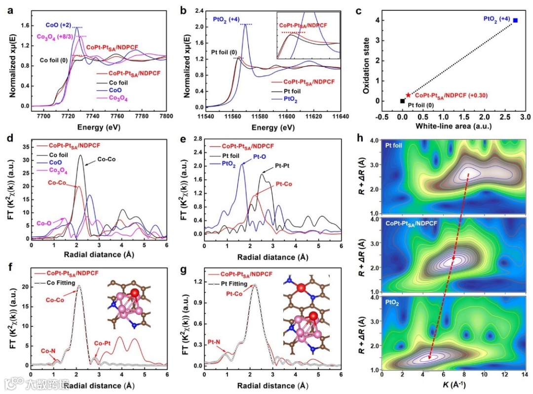 XANES研究表明: Co原子的价态接近零价, Pt的价态略大于零(+0.30),这可能是归因于Pt与N的配位。EXAFS研究进一步表明: Co主要形成CoPt合金纳米晶而不是SAs,而 Pt除了形成PtSA外还和Co原子形成CoPt合金。CoPt-PtSA/NDPCF的WT等值线图显示出与Pt箔和PtO2不同的最大强度,对应于Co-Pt相互作用。基于此我们得出结论:Co主要形成CoPt合金合金,而PtSA与除了N配位还形成了CoPt合金,。