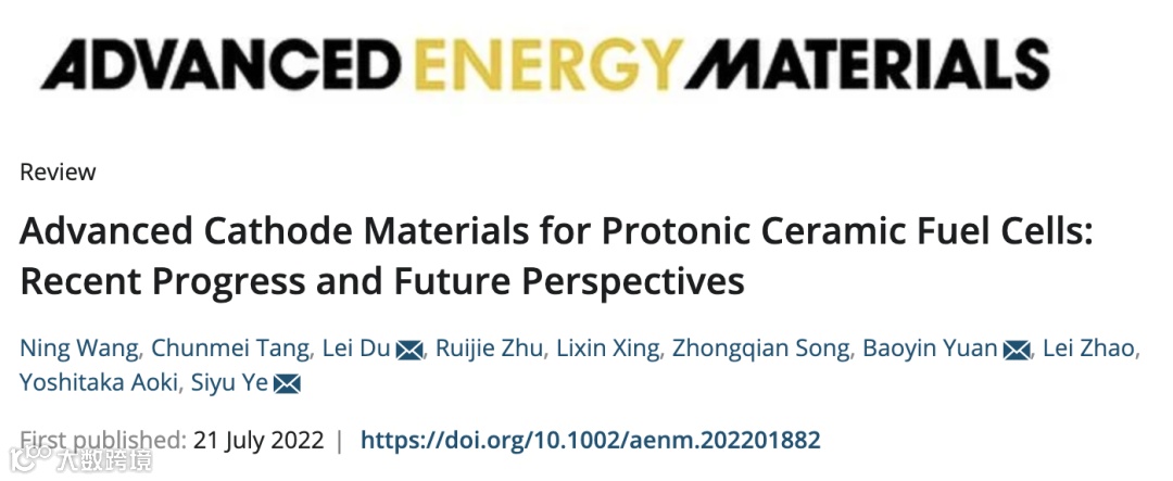 N. Wang, C. Tang, L. Du*, R. Zhu, L. Xing, Z. Song, B. Yuan*, L. Zhao, Y. Aoki, S. Ye*, Advanced Cathode Materials for Protonic Ceramic Fuel Cells: Recent Progress and Future Perspectives. Advanced Energy Materials, (2022). DOI: 10.1002/aenm.202201882.