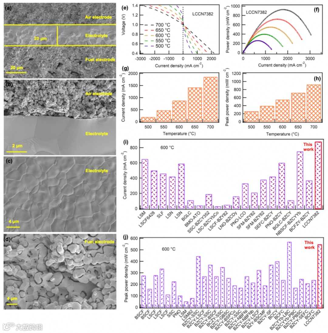 氢能的高效利用,有助于“碳达峰、碳中和”这一目标的有效实现。燃料电池作为直接使用氢能发电而不产生任何碳排放的器件备受青睐。目前,常见的燃料电池按照工作温度可分为低温质子交换膜电池(PEMC; <200℃)和高温固体氧化物电池(SOC; >800℃)。然而两类电池均存在短板:由于工作温度较低,PEMC通常需要使用大量贵金属催化剂;SOC工作温度较高,不需要使用贵金属催化剂,但其寿命受到严重制约。