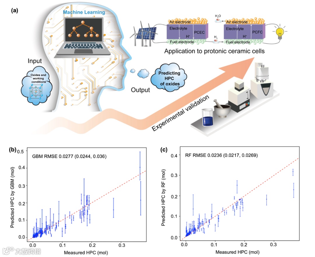 可在中温区域(400-700℃)工作的质子陶瓷电池(PCC)既不需要贵金属催化剂,又可实现较高的能量转换效率(热电联供等),近年来备受瞩目。但是缺少高效质子传导的空气极是制约PCC发展的关键之一。传统的材料开发往往面临周期长,试错成本高等缺点。随着人工智能的发展以及材料数据库的增加,机器学习逐渐应用到材料科学领域。因此,本研究报道了机器学习加速PCC空气极氧化物的开发。