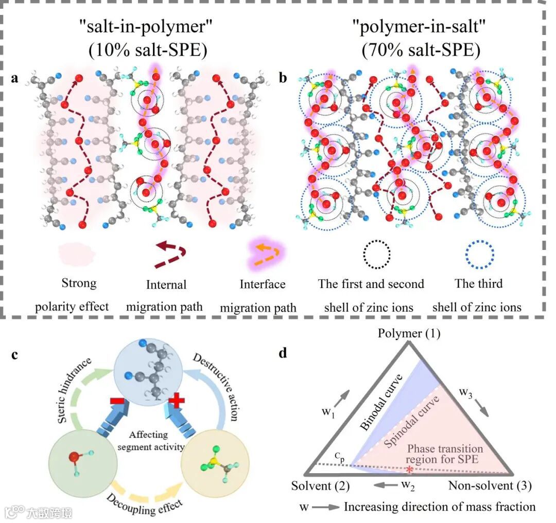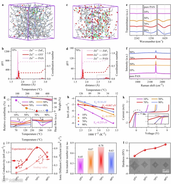 ZnF2和PAN参与的溶剂化结构展现出相关概率峰值显著偏小的特性,这种弱的溶剂化结构更加有利于离子输运。盐对PAN的作用,主要体现在破坏了相邻氰基的强相互作用和提供了丰富的界面通道,降低了结晶性和玻璃化转变温度,使链活性极大增强,最终削弱了离子传输活化能,获得了大的离子电导率和迁移数。另外,过多的盐反而因为PAN及界面减少,使离子传输速率减小。