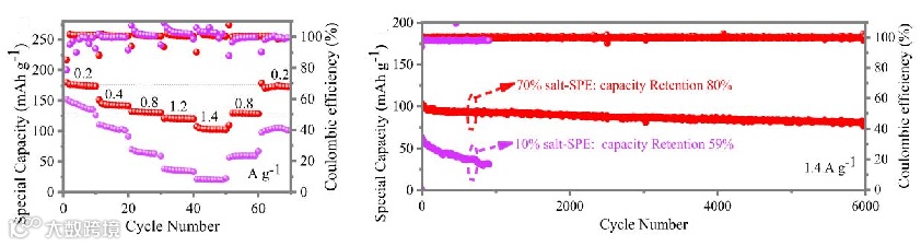 具体而言,Zn(OTf)2作为导电盐的同时,有效破坏了相邻氰基间的强相互作用,增强了PAN链段的活性和有效的溶剂化作用。而微米ZnF2粒子作为无机填料一方面加速了界面离子输运动力学,另一方面通过解耦Zn2+和OTf-,极大的提升了Zn2+转移数。PAN的局部分解和固有的ZnF2促使氟化固态电解质间相极易生成。使用70% salt-SPE(“盐包聚合物”电解质)的Zn//Zn对称电池具有3200 h的超长循环寿命,远远长于使用10% salt-SPE(“聚合物包盐”电解质)的电池(533 h)。使用70% salt-SPE的Zn//MnHCF全电池在0.2 A g-1条件下提供了176 mAh g-1的高比容量,随着电流密度增加到1.4 A g-1,容量仍保持有104 mAh g-1。而使用10% salt-SPE时,0.2 A g-1容量仅为141 mAh g-1,1.4 A g-1容量为19 mAh g-1。更重要的是,Zn//MnHCF电池在6000个循环中表现出超长的循环稳定性,并保留了80%的初始容量,远远好于10% salt-SPE(1000个循环后保留了59%的容量)。通过“盐包聚合物”来降低聚合物结晶性和诱导原位生成氟化固态电解质间相,实现锌离子的均匀沉积和提高电化学性能的设计策略具有一定的普适性。