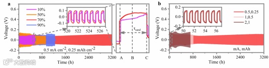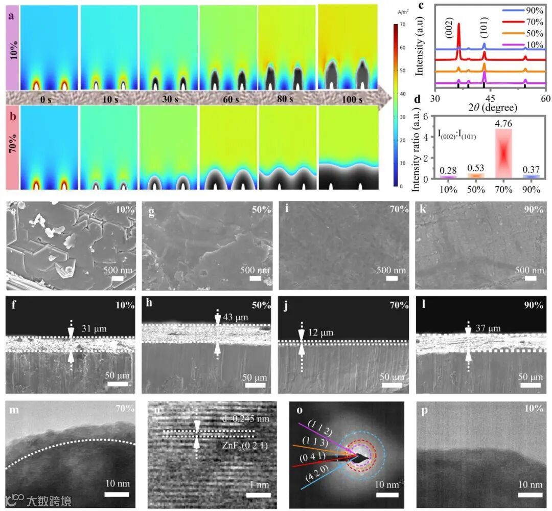 模拟的结果表明70% salt-SPE(“盐包聚合物”电解质)电流密度分布更加均匀,最终实现了光滑的锌沉积,SEM图像给予了直接证明。XRD及峰强统计结果佐证了锌离子沿着(002)晶面生长且无腐蚀产物生成。导致这一结果的潜在原因除了电解质本身具有的良好的锌离子传输性能外,还被归因于富含氟化锌的复合固态电解质间相。最后,这一切都预示着这个工作必将获得优异的性能。