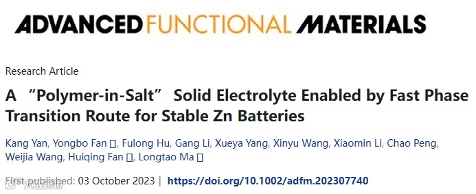 Kang Yan, Yongbo Fan,* Fulong Hu, Gang Li, Xueya Yang, Xinyu Wang, Xiaomin Li,Chao Peng, Weijia Wang, Huiqing Fan,* and Longtao Ma*. A “Polymer‐in‐Salt” Solid Electrolyte Enabled by Fast Phase Transition Route for Stable Zn Batteries[J]. Advanced Functional Materials, 2023: 2307740.