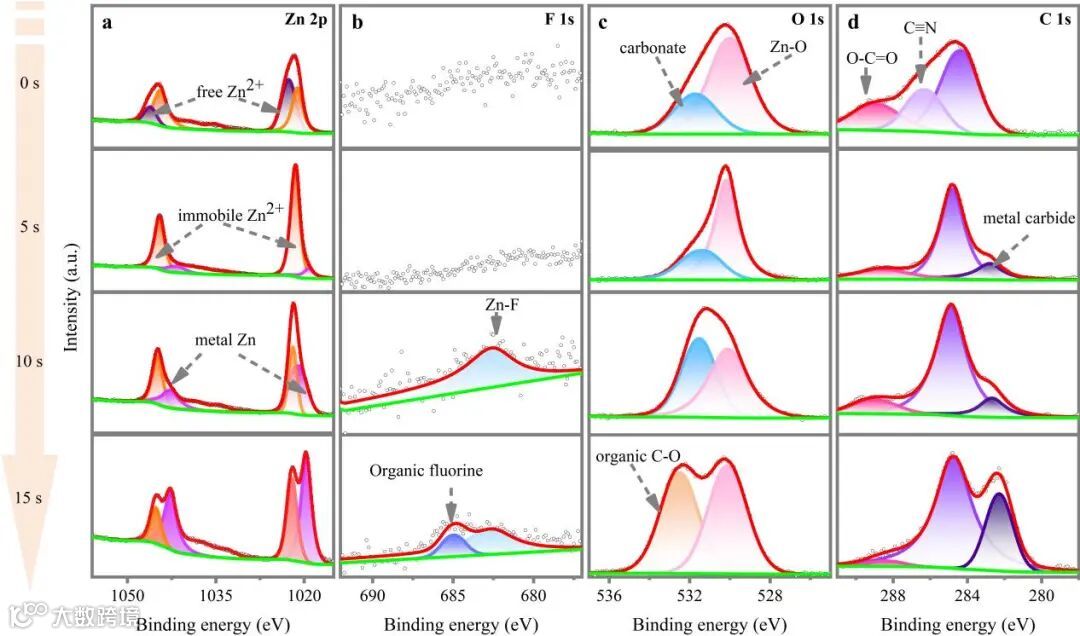 图4.锌阳极充放电循环后的表面相及不同蚀刻时间下Zn 2p (a)、F 1s (b)、O 1s (c)和C 1s (d)的高分辨率XPS光谱。