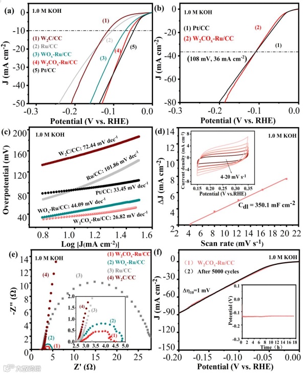 常见的催化体系大多是根据Volmer-Heyrovsky机理进行的,其中Tafel斜率超过40 mV dec-1(约40~120 mV dec-1)。本文以简单的制备方法合成了W2COx-Ru,并详细的探究了其碱性析氢过程中的电化学性能(图2),电化学测试结果发现,目标材料具有优异的电化学性能(52 mV)且其Tafel斜率仅为26.82 mV dec-1,这表明以Volmer-Tafel机制为决速步骤的主导策略是有效的。