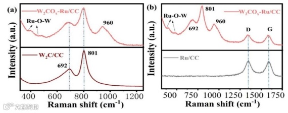 利用拉曼光谱进一步探讨了W2C/CC、Ru/CC和W2COx-Ru/CC异质结的结构信息(图3)。W2C/CC和W2COx-Ru/CC在692和801 cm−1处的峰值信号主要来源于标准碳化钨。W2COx-Ru/CC中约960cm−1处的峰与二阶声子模式激活的结晶紊乱有关,这也意味着Ru种系的成功引入。在相关的Ru拉曼检测中,仅观察到碳的D和G波段的信号。除了典型的振动模式外,在约400cm−1处存在W2COx-Ru/CC的Ru-O-W振动,为桥接氧的存在提供了直接依据,进一步验证了在氧阴离子封端的W2C表面上由Ru团簇形成的双组分结构。