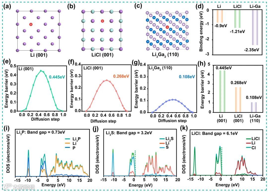 本文通过DFT理论计算证实了LGC人工混合层的优势。选择Li (001)、Li3Ga2 (110) 和LiCl (001) 表面模型来研究了Li+的结合能和迁移动力学。Li3Ga2 表现出比LiCl更强的结合能,表明Li3Ga2对Li+具有更高的亲和力。优异的亲锂性为Li+提供了传输路径,可以有效地控制Li+的均匀沉积。同时,Li+在LiCl (001) 和Li3Ga2 (110) 界面上的迁移动力学结果表明,Li原子在LiCl (001) 和Li3Ga2 (110) 上的迁移势垒能分别为0.268和0.108eV,均低于Li(001) 表面。Li3Ga2 (110) 的最低迁移势垒允许Li+在LGC层的快速传输,这将有利于推动Li+在人工LGC层底部的沉积。此外,DOS曲线表明LiCl具有6.1 eV的宽带隙,是一种优异的绝缘体材料,可以有效地阻止电子隧穿,从而有效防止锂金属在界面或电解质内部成核形成锂枝晶。