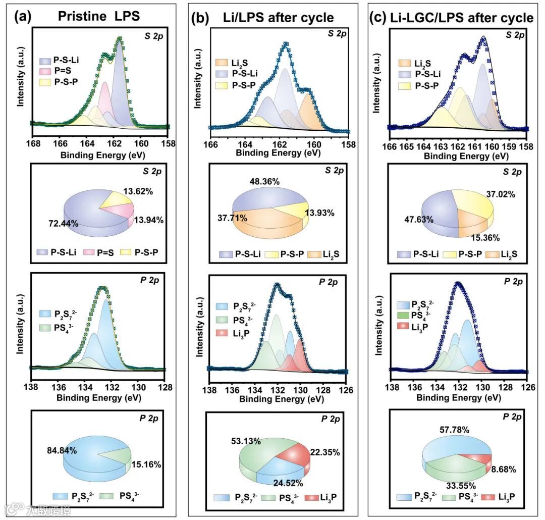 该工作通过XPS进一步验证LGC界面有效地阻止了副反应的发生。结果显示,在Li|LPS|Li电池循环后,LPS电解质表面出现大量的Li2S特征峰,比例高达37.71%。尽管Li2S也出现在LGC-Li/LPS界面上,但仅占15.36%。由于锂金属的强还原性,将硫化物还原导致大量Li2S出现在LPS/Li界面上,而LGC层则有效地阻止了副反应的发生。同理,对P元素进行分析,循环后,LPS/Li界面上出现Li3P峰,这是电解质的还原产物,表明锂金属的强还原性降低了P的价态并破坏了电解质结构。然而,循环后的LGC-Li/LPS界面其还原产物含量较小(仅为8.68%)。表明LGC层作为阻挡层减轻了副反应的发生,从而有效地稳定了界面并保护了LPS结构。