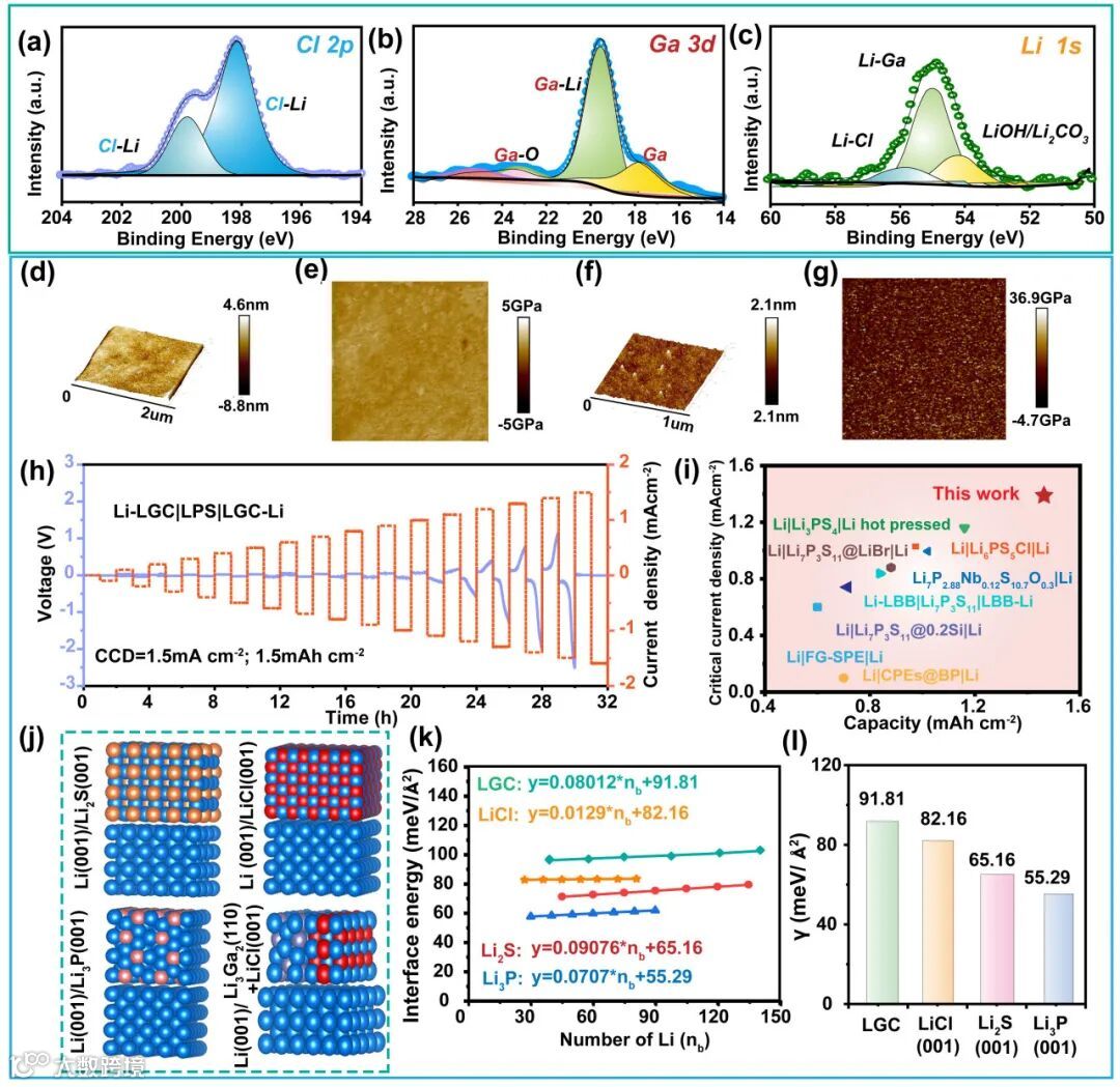 该工作通过理论计算,提出了一种合理的设计方法来获得稳定的Li/LPS界面。采用简单、低成本的策略在LPS/Li之间构建了独特的亲锂/高界面能Li-Ga/LiCl(LGC)界面层。这种方法有效地隔离了锂金属和SSE,防止了不良副反应的发生。得益于混合界面中LiCl的高界面能和电子绝缘性,锂枝晶得到了有效的抑制;Li-Ga合金相则具有优异的亲锂性、低的扩散势垒,可以提供均匀的电场分布并诱导Li+的快速传导。从而实现了Li/LPS界面的致密化,这有助于降低界面阻抗、均匀Li+通量和抑制连续的副反应。这项工作为实现高性能硫化物固态锂金属电池提供了一种基于理论计算的合理设计方法。