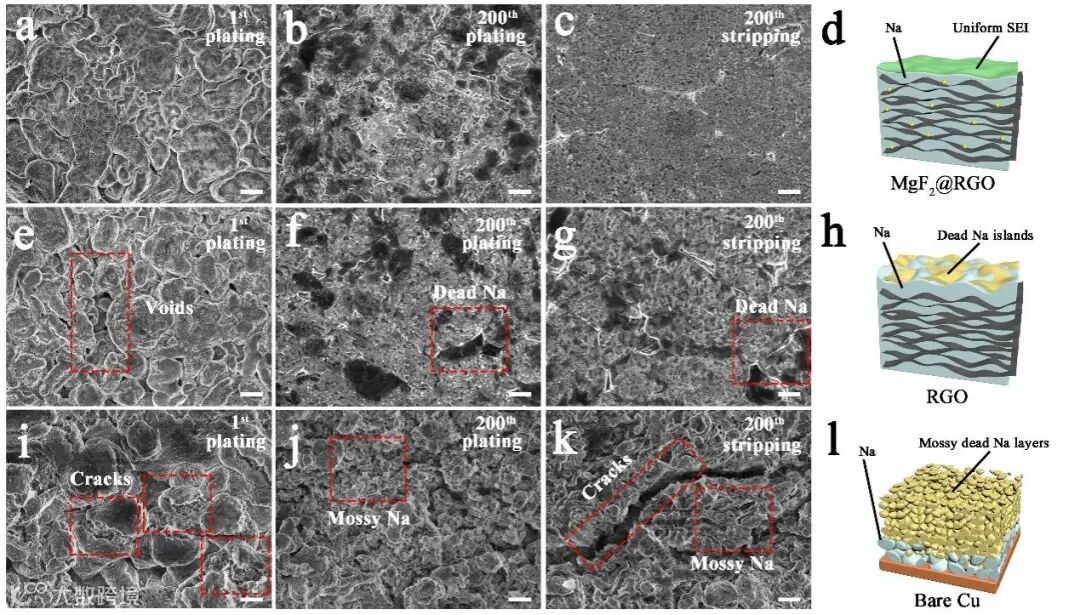 图2. 钠金属在MgF2@RGO 集流体上循环第1周沉积(a),第200周沉积(b),和第200周剥离(c)的SEM电镜照片,以及相应的示意图(d)。钠金属在RGO 集流体上循环第1周沉积(d),第200周沉积(e),和第200周剥离(f)的SEM电镜照片,以及相应的示意图(g)。钠金属在Cu集流体上循环第1周沉积(i),第200周沉积(j),和第200周剥离(k)的SEM电镜照片,以及相应的示意图(l)。比例尺20 µm.