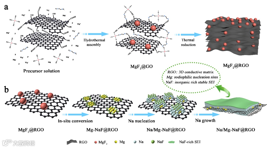 通过Mg2+离子与氧化石墨烯表面官能团的静电相互作用,将MgF2纳米颗粒均匀的负载在超薄的石墨烯片层上。MgF2纳米颗粒可以在金属钠沉积的过程中,原位转化成Mg和NaF. 其中,Mg因为与Na的合金化作用,可以作为亲钠的成核位点,引导钠金属均匀沉积在石墨烯片层上。