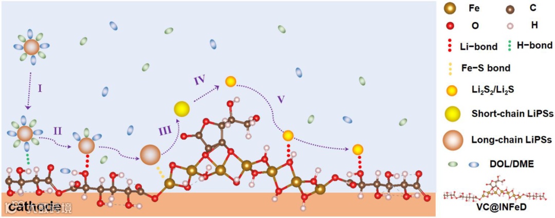 步骤I,通过多个H键使VC@INFeD催化剂/电解质界面上的溶剂化LiPSs富集;步骤II,在Li键的帮助下,在VC@INFeD表面快速脱溶和转移LiPSs;步骤III,INFeD多价态Fe2+/Fe3+催化中心促进长链LiPS转化;步骤IV,VC促进短链LiPS转化;步骤V,Li键辅助Li2S2/Li2S的转移和后续转化。