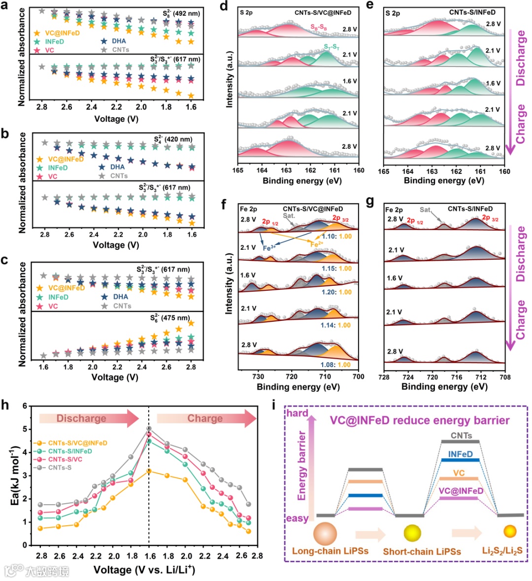 此外,在充电过程中,他们还监测了Li2S3电解液中的S62−和S3*−信号,结果显示VC@INFeD对Li2S的分解表现出较好的催化作用。这表明VC@INFeD电池在长链和短链LiPSs上均表现出良好的级联催化性能。半原位S 2p和Fe 2p XPS光谱分析显示出VC@INFeD具有良好的硫催化可逆性。在整个放电和充电周期中,CNTs-S/VC@INFeD电池的活化能比其他电池低得多,表现出最低的反应势垒和最佳的催化效果。