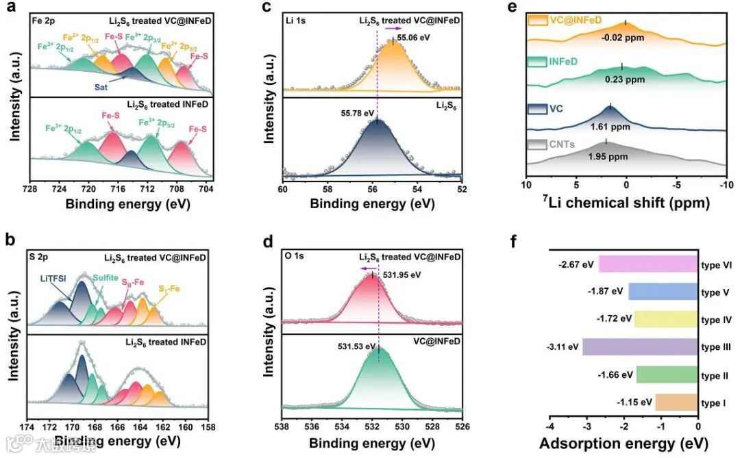 由于VC@INFeD和溶剂化LiPSs之间氢键的形成,VC@INFeD可以在20秒内捕获几乎所有Li2S6。为了进一步阐明吸附机制,并探究对去溶剂化过程,还测试了XPS和固态7Li核磁共振(7Li NMR)谱。两者均证实了Fe−S键和Li键的生成,而Li键的形成可以降低VC@INFeD上Li+的迁移势垒,有助于Li+的快速迁移/补充。