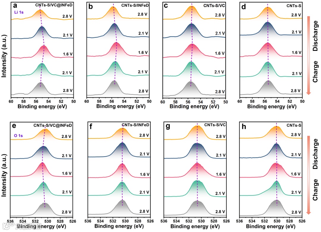 从放电/充电至不同深度的电池中收集了一系列半原位Li 1s和O 1s XPS数据。CNTs-S/VC@INFeD中的Li 1s峰和O 1s峰的移动表明电子从LiPSs向VC@INFeD的转移是可逆的。根据Li键形成理论,推测Li…O键的形成主要是由于通过INFeD的LiPSs和−OH形成的Li…O−H桥。大量Li…O键的形成表明,INFeD显著增强了Li的补充,这不仅可以促进LiPS在催化剂表面的转移,还可以促进随后的硫转化。