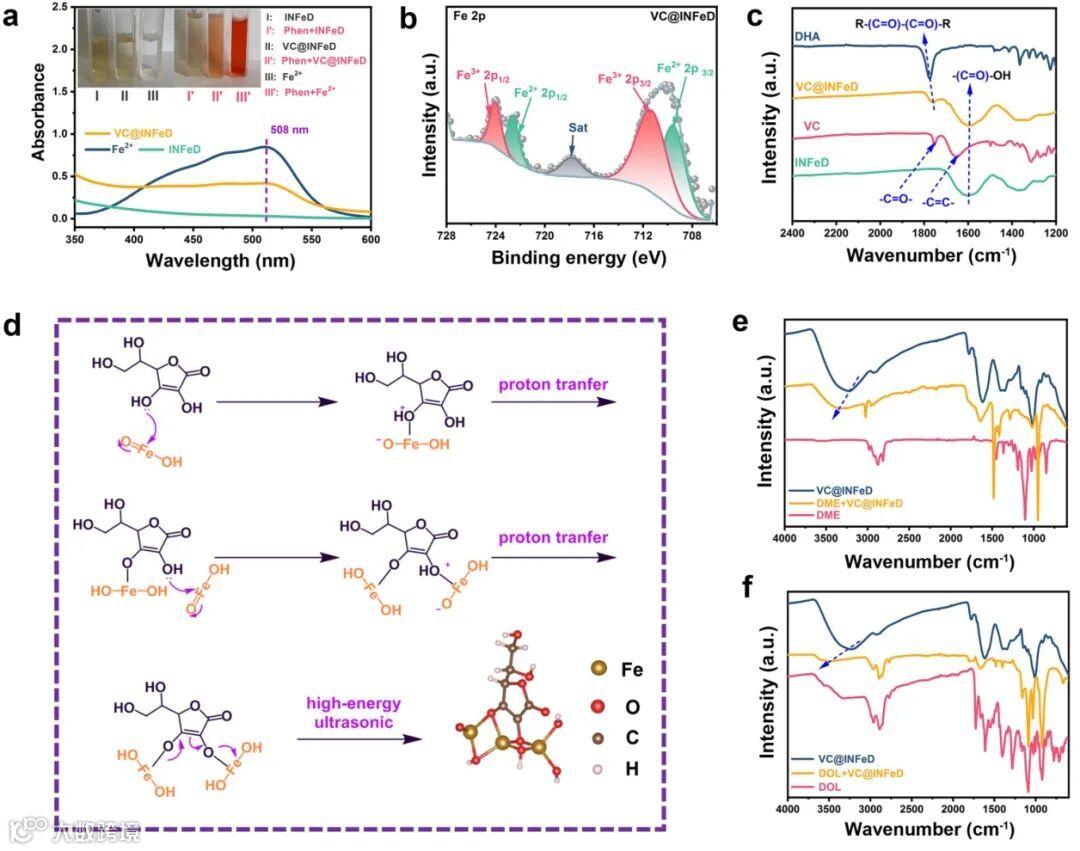 研究发现,在强还原剂VC的辅助下,INFeD的Fe3+很容易转化为Fe2+,加入邻二氮菲(Phen)指示剂后,Phen和Fe2+生成的配位产物使棕色的INFeD溶液变成浅红色。在紫外可见(UV-vis)光谱与XPS谱中再次证实了在VC@INFeD中Fe2+的生成。同时,该反应还出现了一个逐步的脱质子过程,据此他们推测了详细的反应过程。利用傅里叶变换红外(FT-IR)和XPS光谱,验证了所提出的反应路径。此外,VC@INFeD可以通过改变传统醚基电解质中Li+/LiPSs的结合构型来明显影响其溶剂化簇。