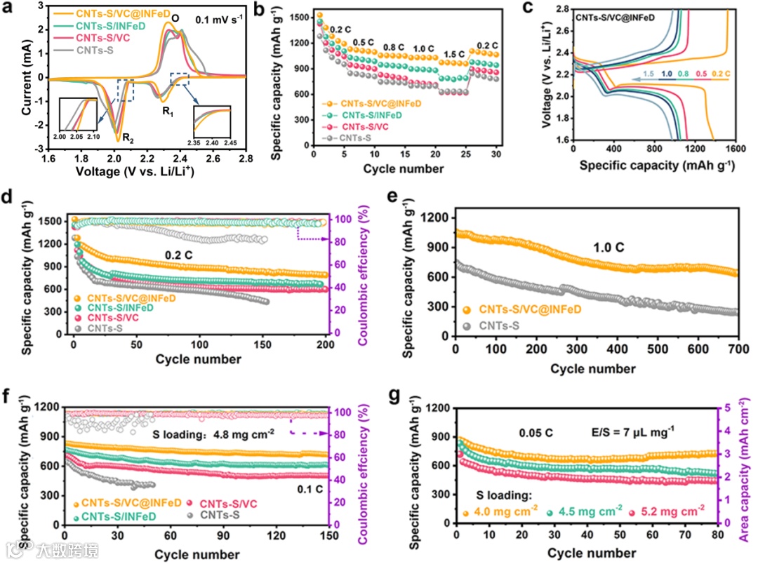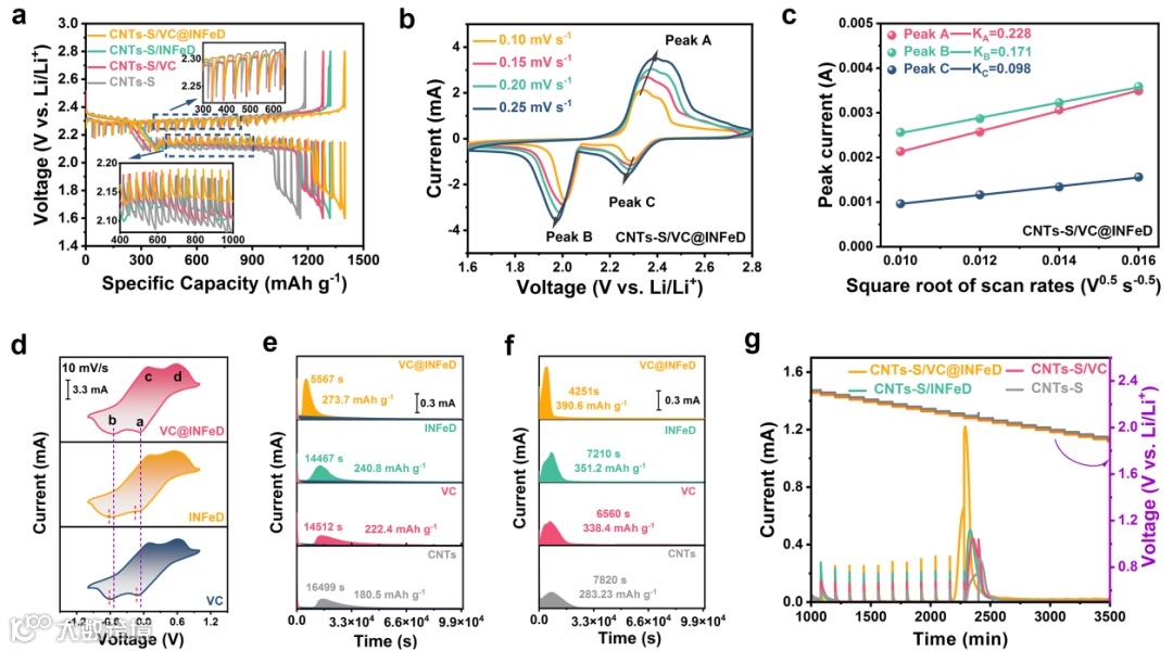 在CNTs-S/VC@INFeD电池的GITT曲线中,证实了VC@INFeD催化剂可以降低电池极化,促进Li+转移动力学。此外,根据不同扫速的CV曲线计算了不同电池的DLi+,CNTs-S/VC@INFeD电池表现出最大的DLi+,这也说明CNTs-S/VC@INFeD电池的Li+运输/补充能力更为优异,反应动力学越快。