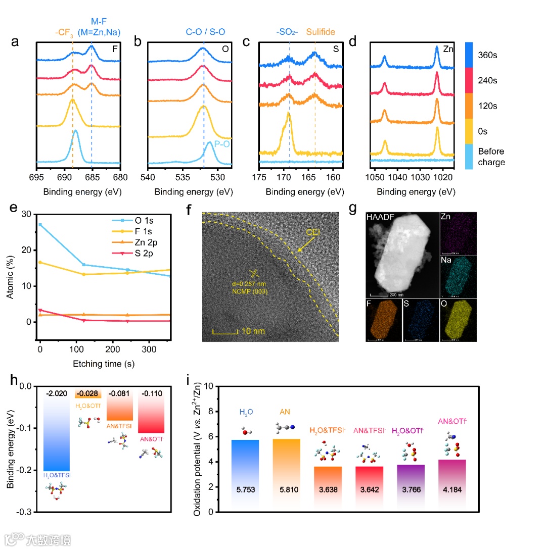 图6:新型杂化电解质中NCMP兼容阴极电解质界面层的存在和组成的实验和理论研究。(a-d)在NCMP阴极上累积的阴极电解质界面层上不同时间溅射氩离子后的F 1s、O 1s、S 2p和Zn 2p的XPS光谱区域图。(e)XPS溅射过程中的元素比例。(f)20次循环后新型杂化电解质中NCMP的透射电镜图像,(g)和能谱元素映射,包括Zn、Na、F、S和O元素。(h)不同溶剂-阴离子对的结合能。(i)计算的氧化电位。