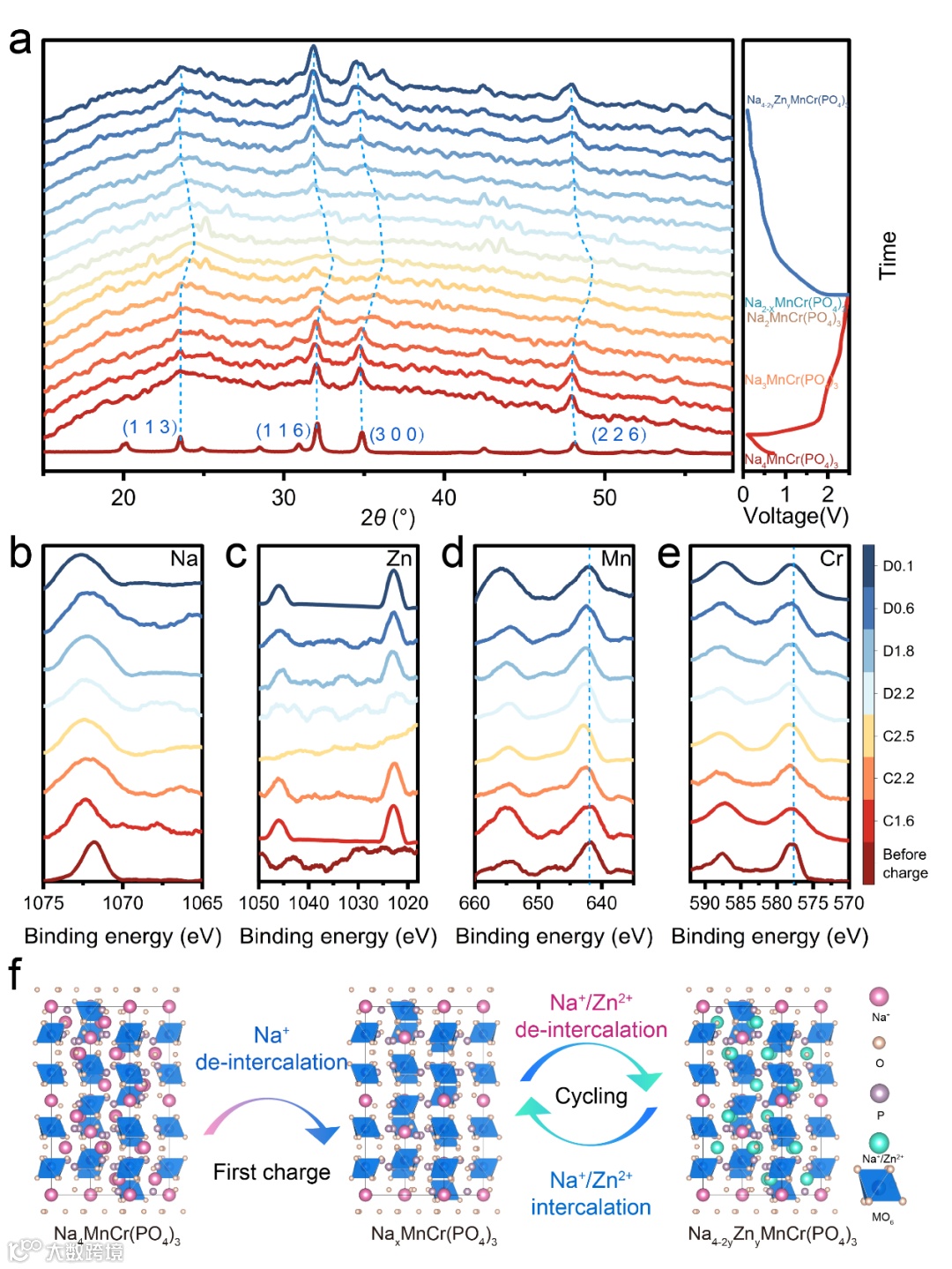 在本次试验中,磷酸铬锰钠作为首次应用于锌钠杂化体系的正极材料,通过原位X射线衍射(XRD)等方法,验证了锌离子和钠离子在充放电过程中能够共同在磷酸铬锰钠正极材料中进行脱嵌,并伴随有两电子以上的电荷转移。