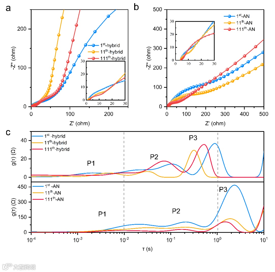 为了对比新型杂化电解液与有机电解液的充放电过程中各环节动力学变化,采用原位电化学阻抗谱并配合时间弛豫分析,研究电池在经过不同次数的循环充放电后,所对应于不同时间常数的电化学反应过程变化,结果显示,新型的杂化电解液能够有效的改善在电荷转移过程中的阻抗,并且伴随有阴极电解质界面相的生成。