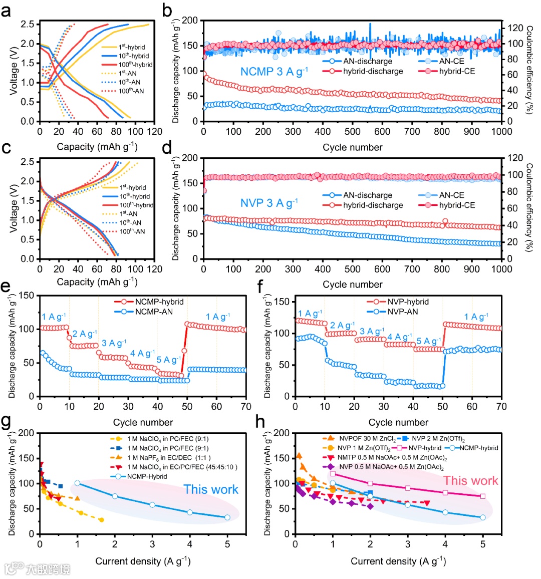 通过匹配两种不同类型的钠快离子导体(NASICON),磷酸铬锰钠(NCMP)以及经典的磷酸钒钠(NVP),相比于有机电解液,新型杂化电解液表现出在大电流下更充分的容量释放,在3A g-1的大电流密度下的超过1000次的循环的能力,以及出色的倍率性能。