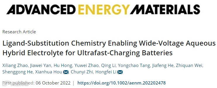 为解决这一问题,本文中,来自华南师范大学的侯贤华教授与南方科技大学的李洪飞助理教授合作,在国际知名期刊Advanced Energy Materials 上发表题为“Ligand-Substitution Chemistry Enabling Wide-Voltage Aqueous Hybrid Electrolyte for Ultrafast-Charging Batteries”的研究性文章。
