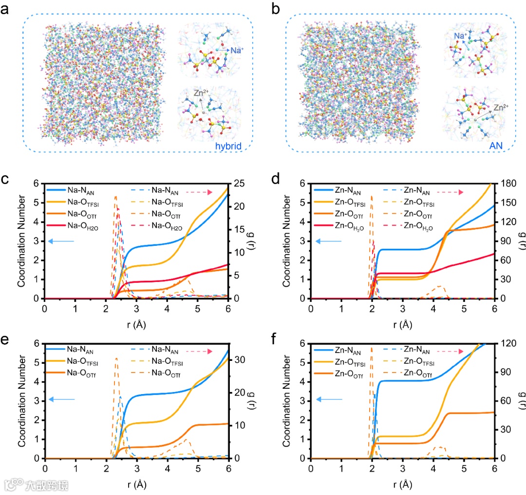 图3:新型杂化电解质和有机电解质的理论计算 (a)新型杂化电解质、(b)有机电解质和每种电解质中的阳离子第一溶剂化壳层的模拟盒快照。(c-d) 新型杂化电解质和(e-f)有机电解质中不同分子对Na+和Zn2+的配位数和径向分布函数。