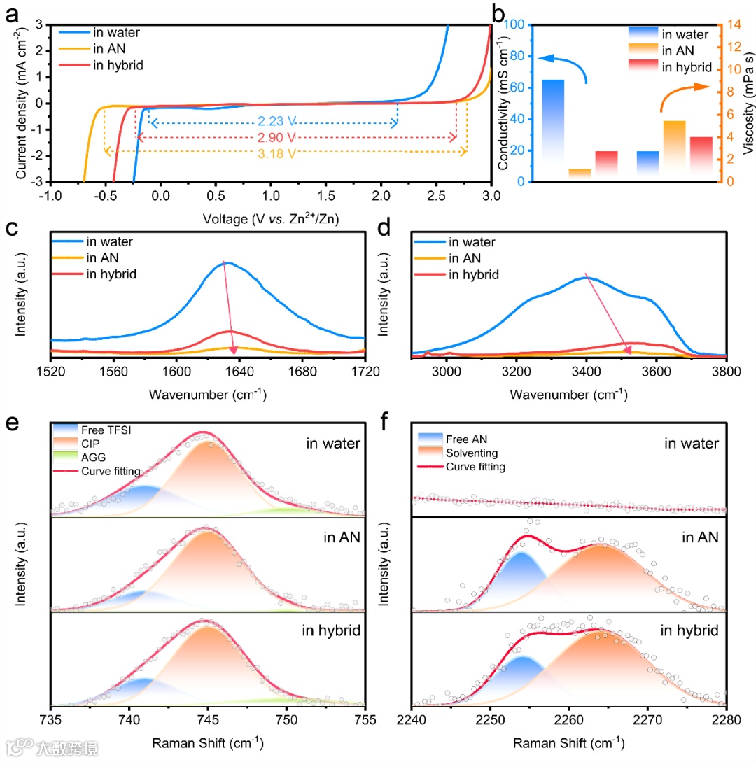 图2:相同盐浓度的电解质在水、有机和杂化溶剂中的溶剂化结构和性质。(a)不同电解质的电化学稳定窗口。(b)三种电解质的离子电导率和粘度。(c-d)不同波长范围内电解质的红外光谱。(e-f)不同电解质的拉曼光谱。