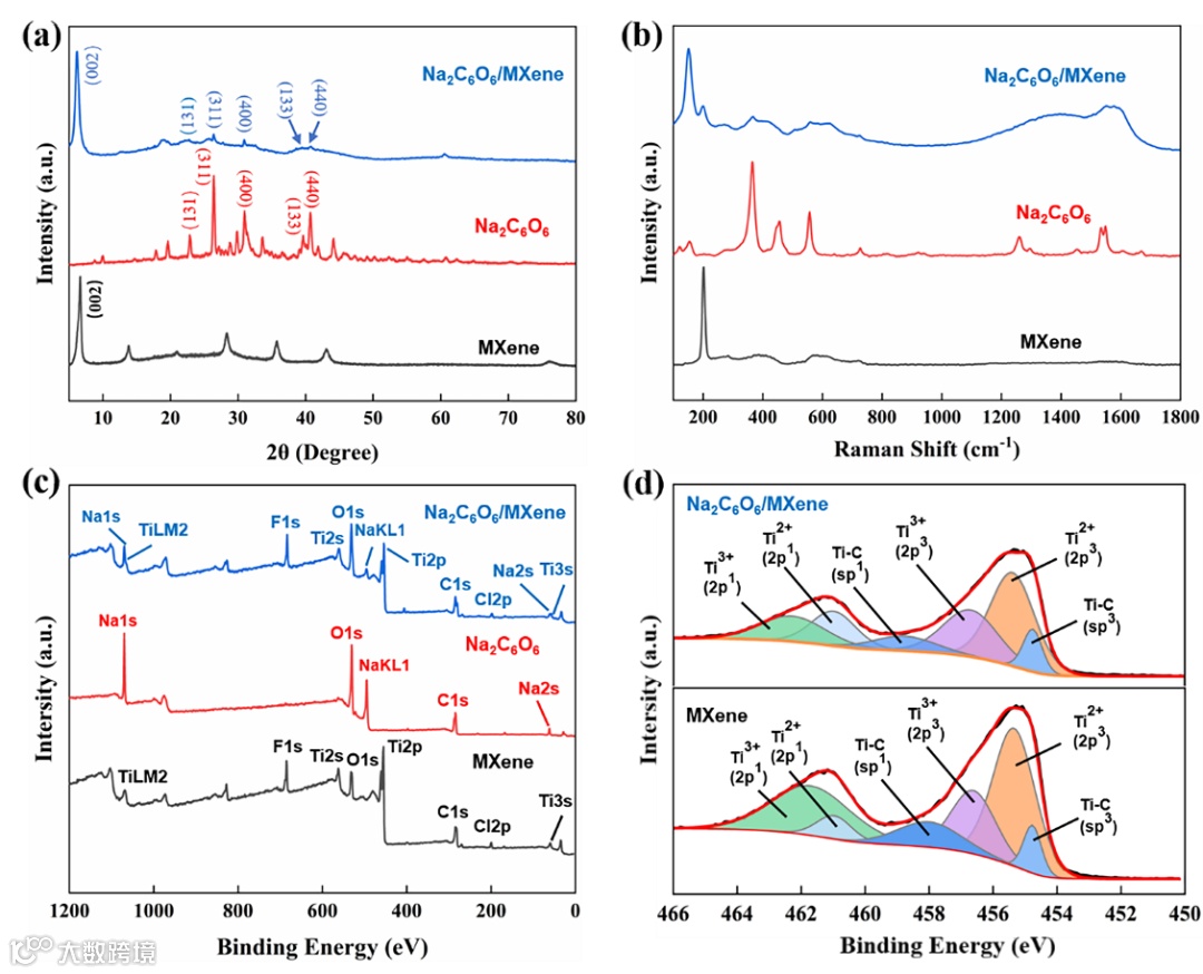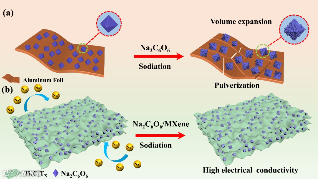 具有高导电性的MXene片可形成导电网络,复合后可提高有机材料的导电性,有利于促进循环过程中Na+的传输。大面积的二维MXene不仅为Na2C6O6材料的负载提供了足够的空间,并对其吸附,防止有机物溶解在电解液中。