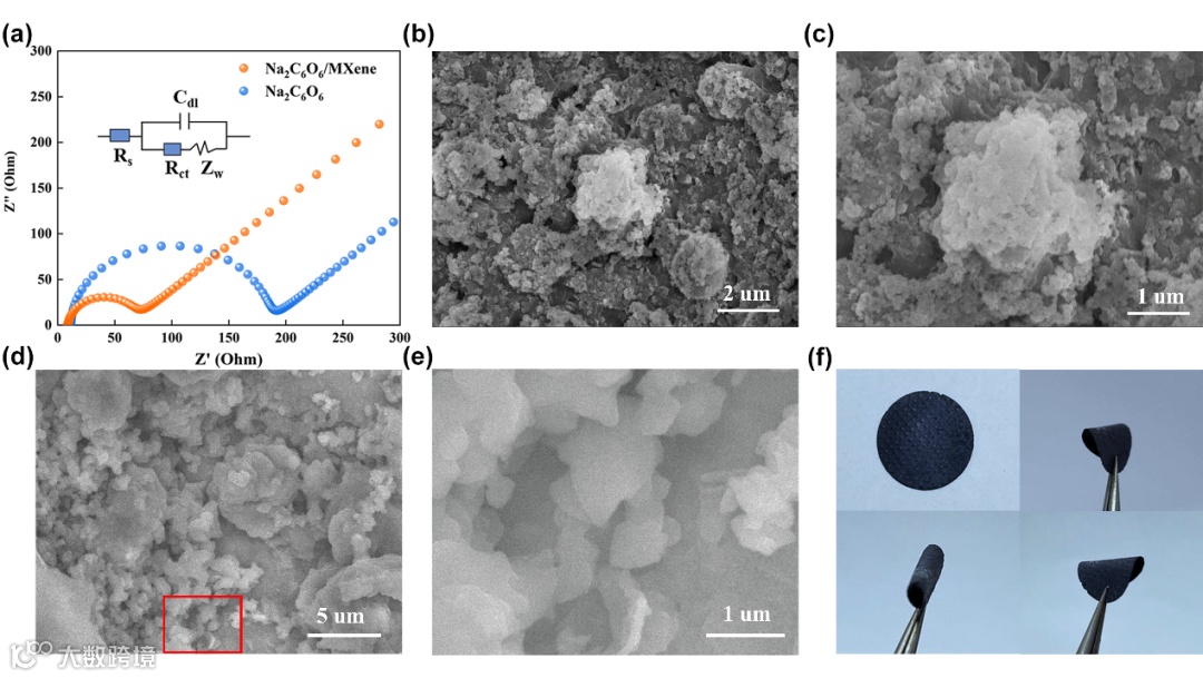 图5. (a) Na2C6O6 和 Na2C6O6/MXene复合膜电极在 20 个循环后的 EIS 测试。(b-c) Na2C6O6电极和 (d-e) Na2C6O6/MXene循环100 次后的 SEM 图像。(f) Na2C6O6/MXene 电极循环 100 次后的数码照片