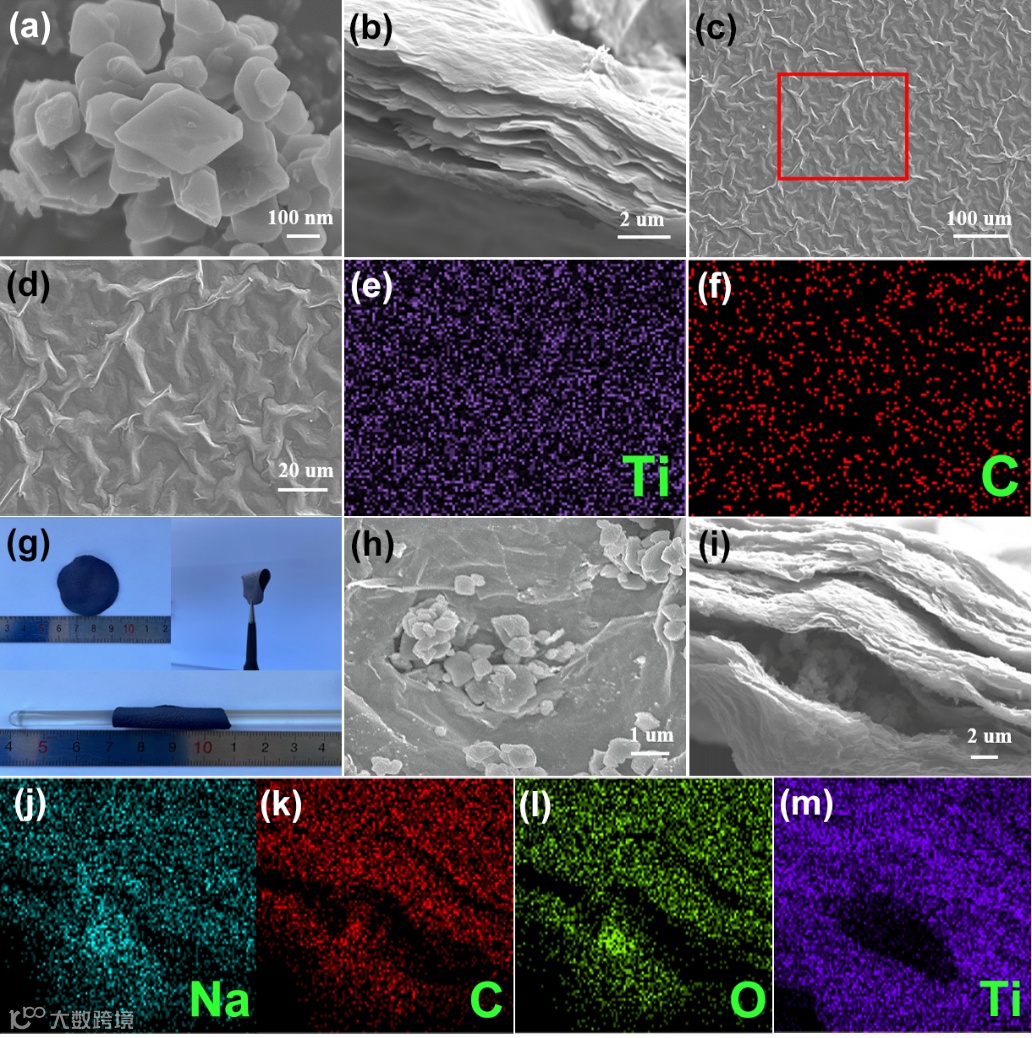 图 2 (a) Na2C6O6的 SEM 图 (b-f) MXene 的SEM 和EDS图。(g) 柔性Na2C6O6/MXene 复合膜图像。(h-m) 柔性Na2C6O6/MXene 复合膜的SEM 和EDS图