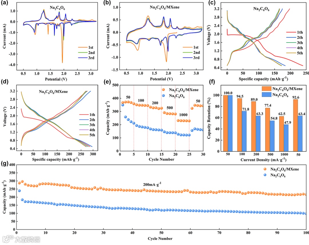 图 4. (a)Na2C6O6电极 和 (b) Na2C6O6/MXene 复合膜电极的 CV 图 (c) Na2C6O6 电极和 (d) Na2C6O6/MXene复合膜电极的充放电曲线 (e) 倍率性能 (f)倍率平均容量保持率 (g)循环性能