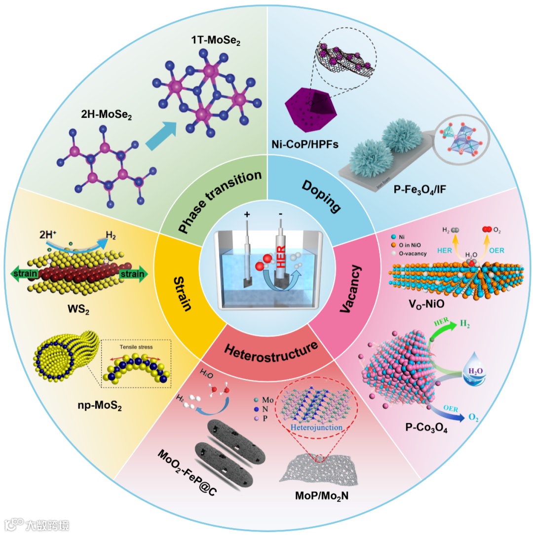 电子结构调控对提升催化剂的本征活性有着至关重要的作用,而探讨不同调控策略的调控机制及优缺点对设计高性能HER催化剂起到推动作用。掺杂和空位能够改变局域电荷分布以及制造缺陷、异质结构中界面的构建能够实现多功能的催化剂、较小的应力应变就能够带来显著的活性提升、相转变对催化剂整体的电子结构进行调控,从而提升催化活性。
