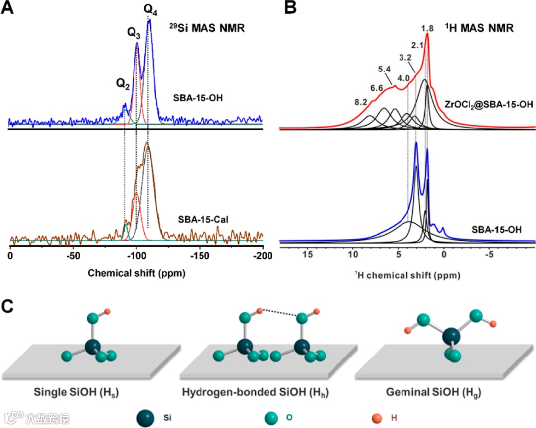 图3. 介孔二氧化硅模板的固体核磁29Si MAS NMR谱(A)和1H MAS NMR谱(B)以及(C)三种可能的Si-OH基团的结构示意图