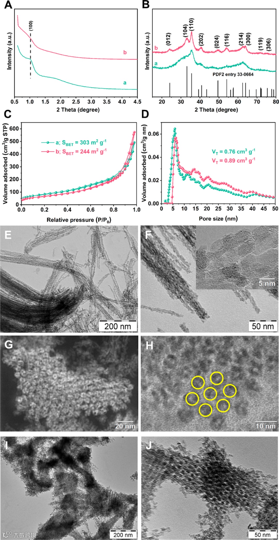 图2. 介孔Fe2O3的结构和形貌表征。(A)小角XRD;(B)广角XRD;(C)氮气物理吸脱附;(D)孔径分布图;(E-J)TEM以及明场或暗场STEM图像