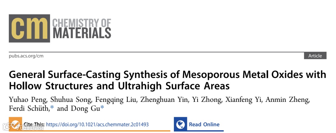 基于此,武汉大学顾栋教授和德国马普煤炭研究所Ferdi Schüth教授团队合作,在国际知名期刊Chem. Mater.上发表题为“General Surface-Casting Synthesis of Mesoporous Metal Oxides with Hollow Structures and Ultrahigh Surface Areas”的文章。